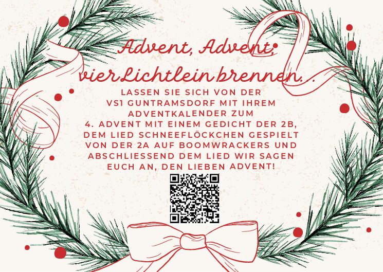 Für den 4. Advent öffnet sich unser Türchen mit einem Gedicht der 2B, dem Lied „Schneeflöckchen“ gespielt von der 2A auf Boomwrackers und als krönenden Abschlusses unseres diesjährigen digitalen Adventkalenders das Lied „Wir sagen euch an, den lieben Advent“ dargeboten von der gesamten VS1!
